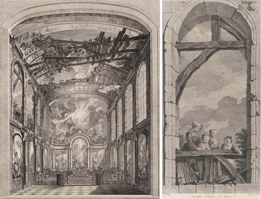 La chapelle des Enfants-Trouvés, ensemble et détail de la première fenêtre feinte en haut à gauche, gravures d’Étienne Fessard, années 1750.