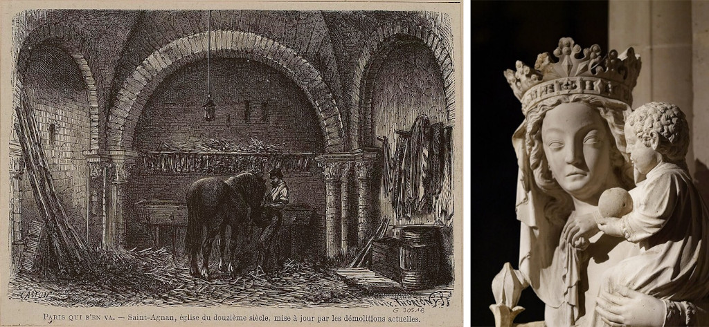 À gauche, « Paris qui s’en va » : la chapelle Saint-Aignan transformée en écurie, illustration de Félix Thorigny (1824-1870) ; à droite, détail de la Vierge, dite « Notre-Dame de Paris », provenant de la chapelle Saint-Aignan.