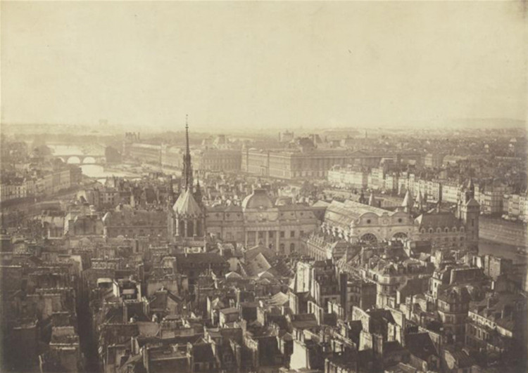 L’île de la Cité vue de Notre-Dame, photographie anonyme, 1855 ; devant la Sainte-Chapelle, le couvent et l’église des Barnabites ; en bas à gauche, la rue Neuve-Notre-Dame.