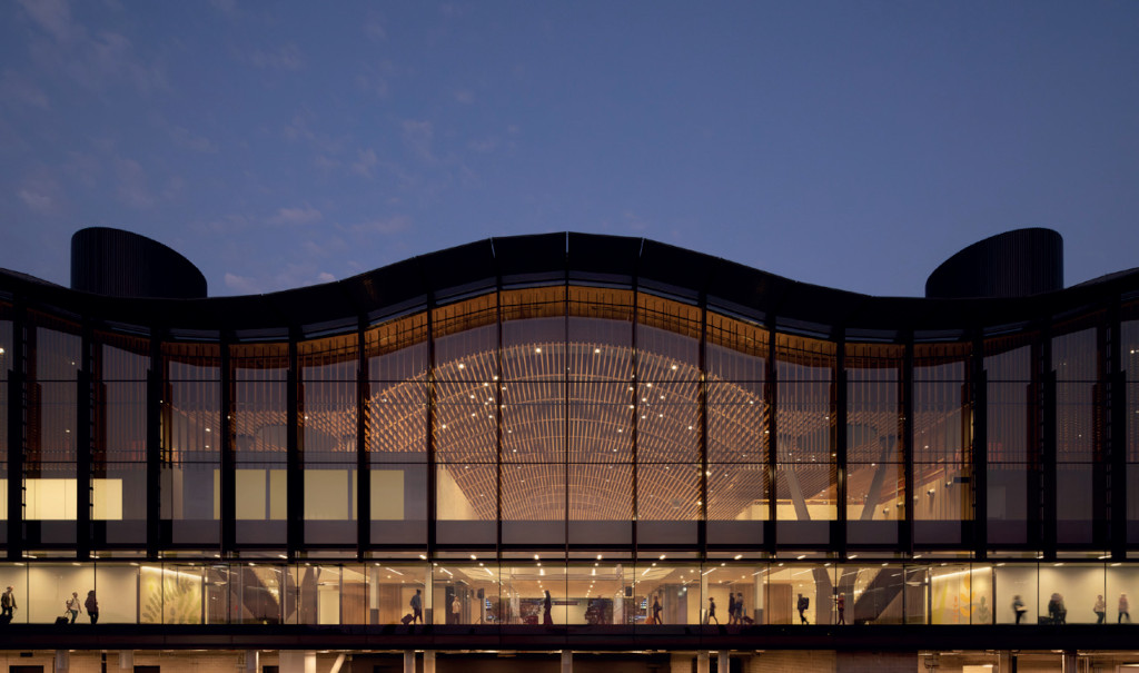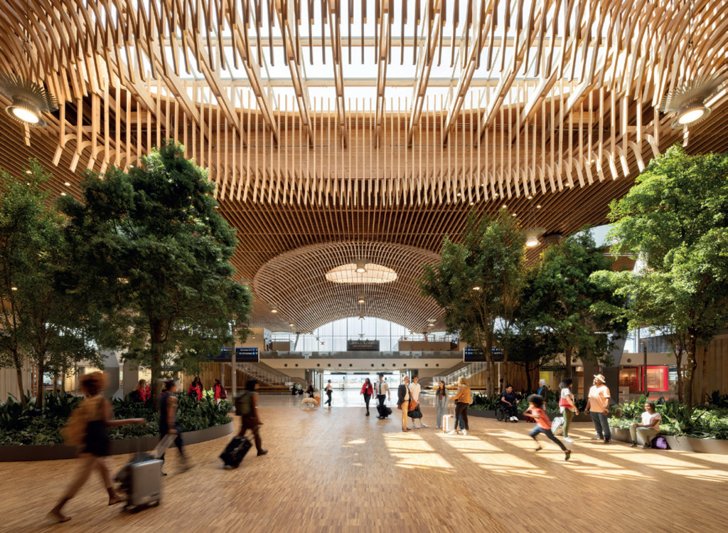 Le Terminal principal de l’Aéroport international de Portland, imaginé par ZGF, s’inspire d’une promenade en forêt pour offrir une expérience apaisante et immersive aux voyageurs. Élément phare du projet, le toit ondulé en bois massif, couvrant plus de 36 000 m², met en valeur l’innovation forestière de l’Oregon. Les matériaux utilisés sont produits à moins de 500 km et s’appuient sur les filières locales. Un système « de la forêt à la charpente » a d’ailleurs été pertinemment mis en place afin de retracer au maximum l’origine du bois.