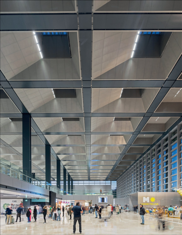 Exprimant le calme et la détente, un nouveau coeur lumineux, signé Foster + Partners, unifie le Terminal 1 par une extension de 22 000 m² sans artificialisation de sol supplémentaire. Ce hall vitré de 22 mètres de haut, construit avec 70 % d’acier recyclé, et doté d’un toit à poutres inversées, est équipé de puits de lumière en aluminium poli permettant une ventilation naturelle.