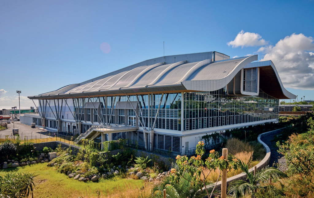 Plus qu’une extension, la nouvelle Aérogare Arrivée de 13 000 m² est, au niveau mondial, la première structure aéroportuaire bioclimatique de cette ampleur en milieu tropical. Dans une île soumise à des phénomènes météorologiques de plus en plus intenses, la prouesse technique est réalisée avec 91 % d’entreprises locales.