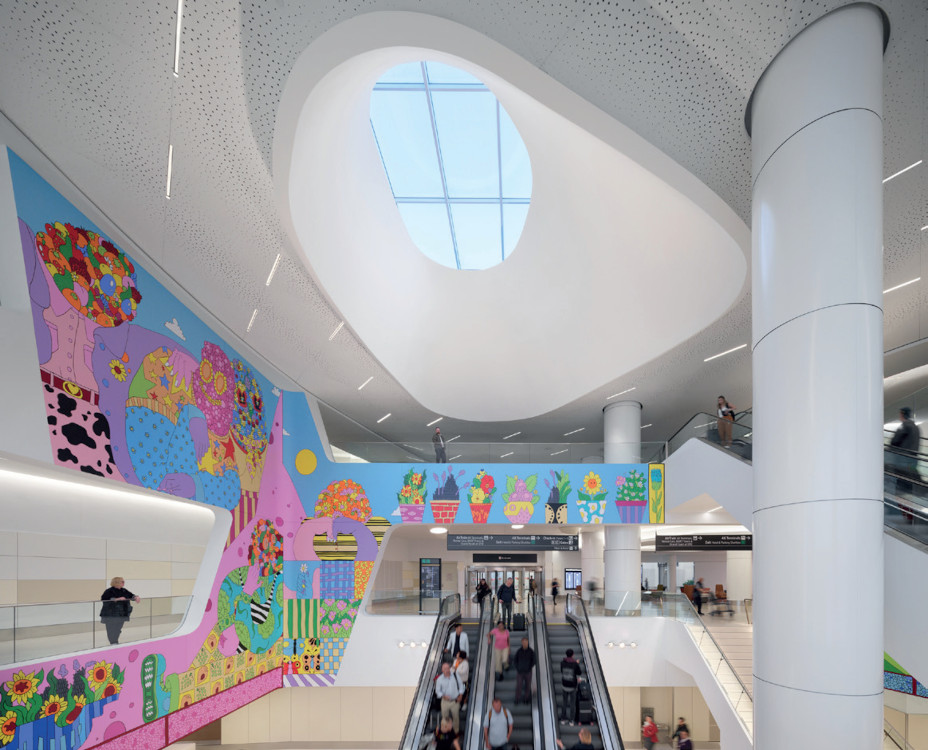 Avec 25 nouvelles portes d’embarquement, le Terminal 1 est le résultat d’une transformation d’ampleur initiée par l’Aéroport international de San Francisco, Gensler et Kuth Ranieri. Répondant à l’un des principaux objectifs, la rénovation a permis une réduction de 79 % de l’empreinte carbone du bâtiment et une baisse de 59 % de sa consommation d’énergie. Traversé à tous les étages par une lumière naturelle et tamisée, le nouveau terminal offre un cadre apaisant et réparateur.