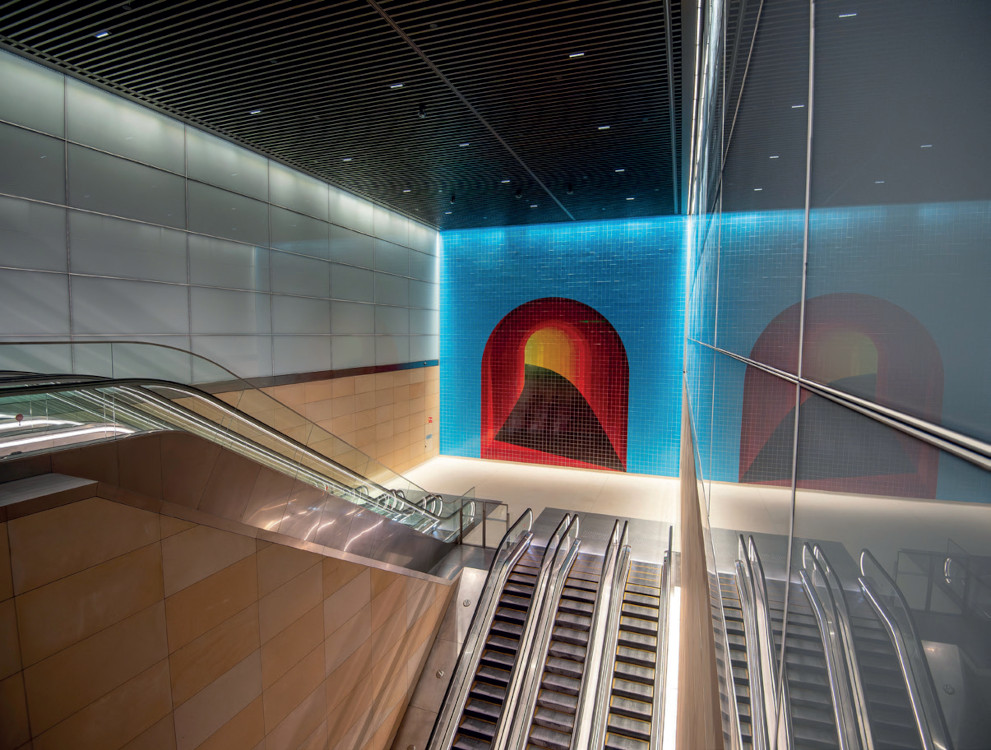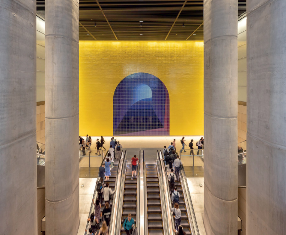À chaque entrée, « The Underneath », œuvre d’art monumentale en carreaux de céramique à la couleur intense, inspirée des premiers tunnels ferroviaires, souligne par contraste les circulations dans des espaces épurés dont les courbes et les variantes de tons épousent la géologie.