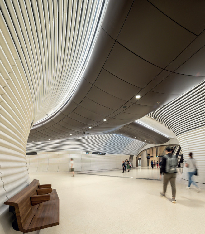 De fait, glissée à 25 m de profondeur sous des immeubles de grande hauteur, la Gare Gadigal, conçue par Foster + Partners (en collaboration avec Cox Architecture) est d’une modernité absolue.