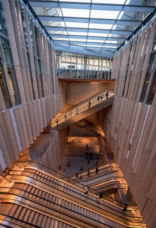 Ce que Dominique Perrault appelle « architectonique du lien » réconcilie les dynamiques verticales d’accès avec les mouvements horizontaux de la ville. Ici, pas de front urbain monumental qui clôt le territoire mais l’utilisation du vide tel un matériau, les grands escaliers mécaniques mettant en scène les mouvements des voyageurs.