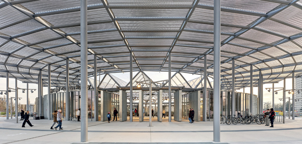 Au centre d’un large parvis piéton, un pavillon ouvert, couvert d’une verrière spectaculaire, floute la limite entre intérieur et extérieur. Il recouvre un vertigineux cylindre de 70 m de diamètre qui laisse circuler l’air et projette différentes ambiances en favorisant par des jeux de reflets, brillances ou filtres, la propagation de la lumière 50 m plus bas jusqu’aux quais de l’une des gares les plus profondes de France.