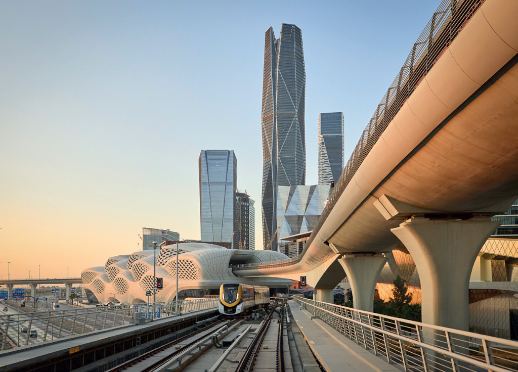 En 2000, la capitale saoudienne, aux 4 millions d’habitants, n’avait pas encore d’infrastructure de transports en commun. Aujourd’hui, la Gare KAFD, dans le quartier financier, est le point clé de correspondance d’un réseau qui compte désormais 176 km de voies et 85 stations, soit le plus long système de transport autonome au monde.