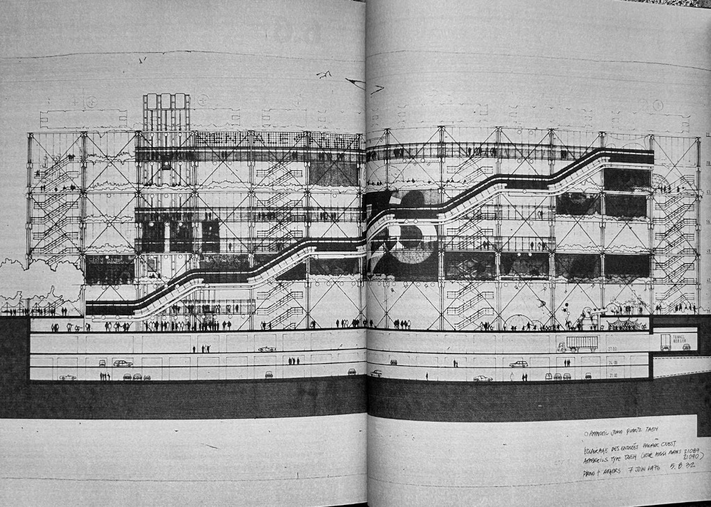 C’était un centre ouvert, « inside outside », anti-institutionnel, pas un musée élitiste mais une machine vivante. L’image a vite disparu mais elle reste l’emblème de l’utopie du concours : façade-média, piazza-agora.