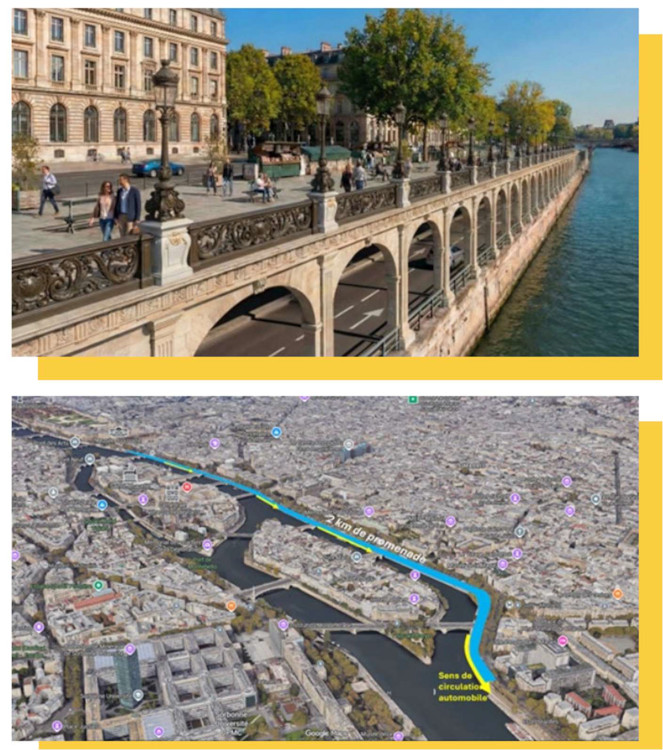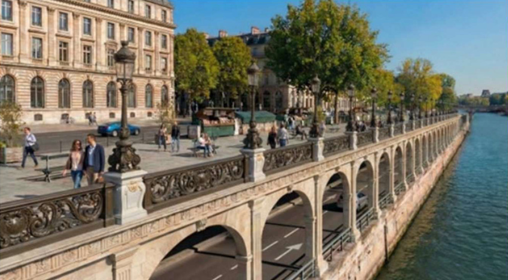 Imposer brutalement un système architectural répétitif, celui des arcades et de leurs balustrades, mettrait gravement en cause une donnée paysagère essentielle : le fleuve est un espace ouvert, un immense vide laissant voir à l’arrière-plan des accents majeurs, de la cathédrale Notre-Dame jusqu’au Palais de Chaillot, en passant par le Louvre et la Gare d’Orsay, le Palais-Bourbon ou le Grand-Palais. Les contraintes d’un cours d’eau soumis aux aléas des crues saisonnières ont abouti à concevoir un système de doubles quais qui s’organisent en paliers de part et d’autre du fleuve. Le quai inférieur est planté, le quai supérieur ne l’est pas en venant au contact du plan d’eau. D’où l’étendue du paysage au coeur même de la ville dense ».