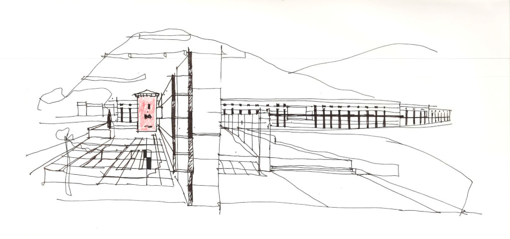 Le projet prend place dans ce régime, au contact d’une eau rapide, certes aujourd’hui contenue mais jamais totalement inoffensive. Tenter l’instabilité, composer avec ce qui échappe. « Les lignes de force de la construction sont tracées dans le fil de l’eau pour n’offrir aucune résistance aux masses d’eau qui dévalent dans le fil du torrent », poursuit l’architecte.