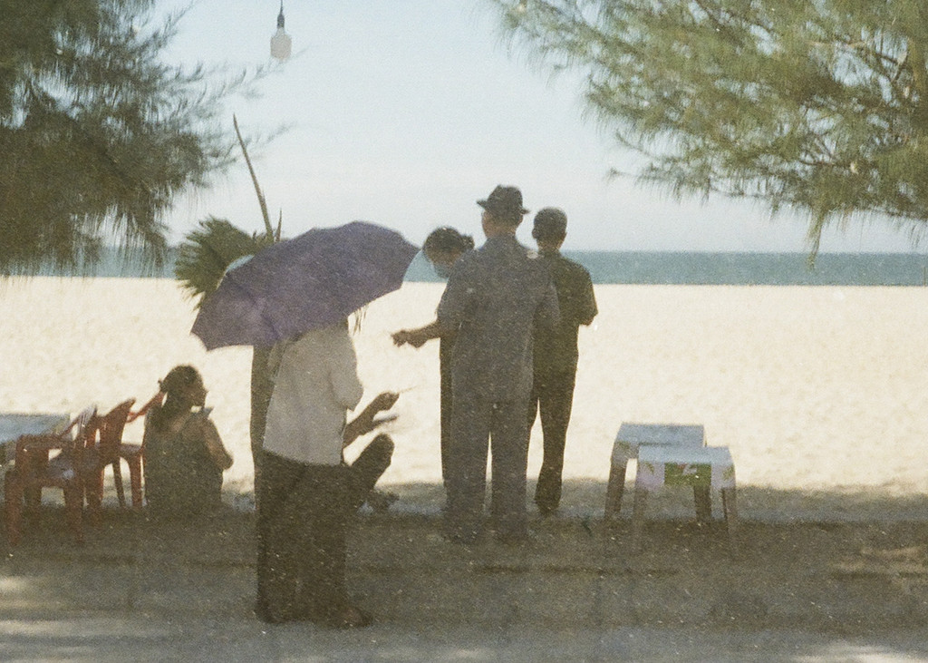 Sur le flanc venté et houleux de l’île, nos ingénieurs descendus de Hanoï pâlissent, ils semblent avoir le mal de mer. Nous décidons de filer sur la plage abritée où se trouvent des baraquements de tôles. Des filaos bleutés à l’écorce grise desquament en longues lanières verticales. Leurs ombrages sur le bord de la plage sont extraordinaires.