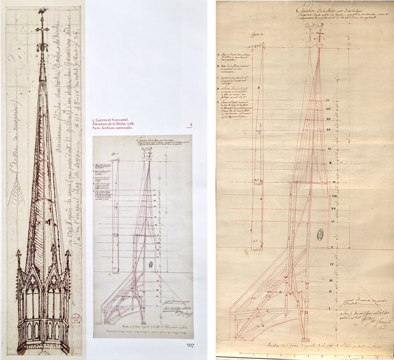 En mettant le dessin des experts de 1788 à côté de celui de Viollet-le-Duc publié en 1861, nous comprenons comment le célèbre architecte a pu légitimer sa propre flèche qui comporte sur les noues des statues fichées sur les poteaux verticaux qui leur servent de piédestaux. Nous comprenons comment il a convaincu tout le monde, savants comme ignorants, que sa flèche ainsi décorée devait être fort proche de celle du XIIIe siècle.***