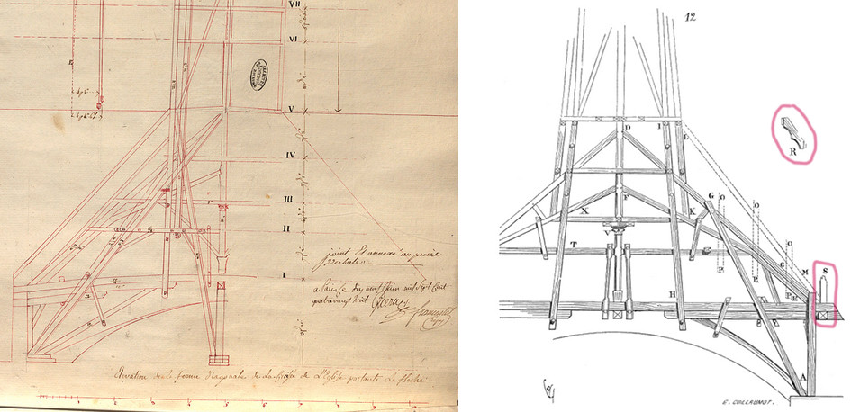 À gauche, coupe de l’ancienne flèche, détail, Archives nationales ; à droite, coupe de l’ancienne flèche selon Viollet-le-Duc, Dictionnaire raisonné de l’architecture du XIe au XVIe siècle, tome V.